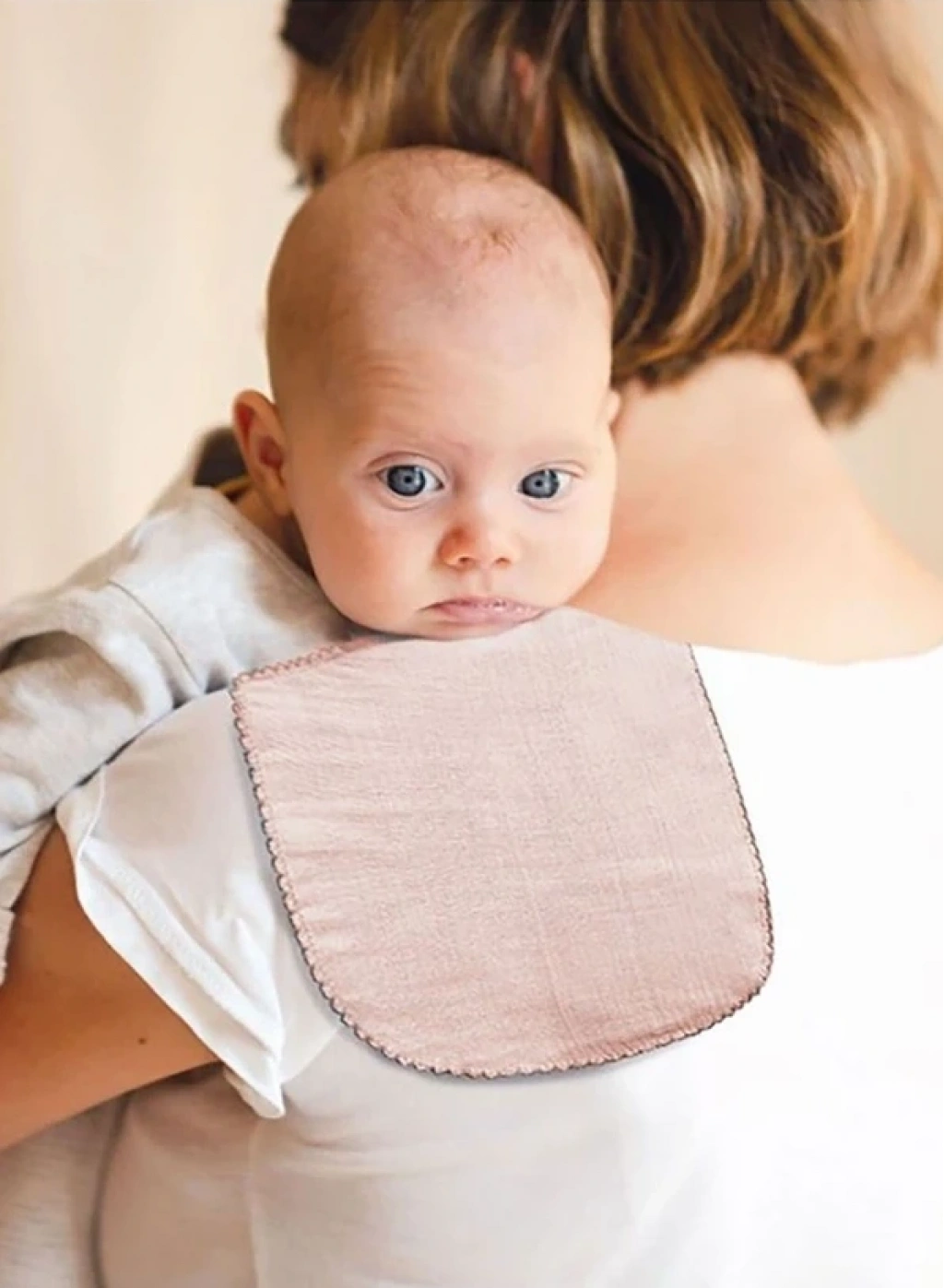 Pamuk: %100 Çocuğun hassas yüzünü temiz tutmak için ideal bir üründür. Ayrıca ebeveynin omuz bölgesinin kirlenmesini de engeller. Yumuşak dokusu ve nefes alabilirliği sayesinde müslin kumaş bebekler için her koşulda rahatlıkla kullanılabilir. Ölçüsü: 22x57 cm